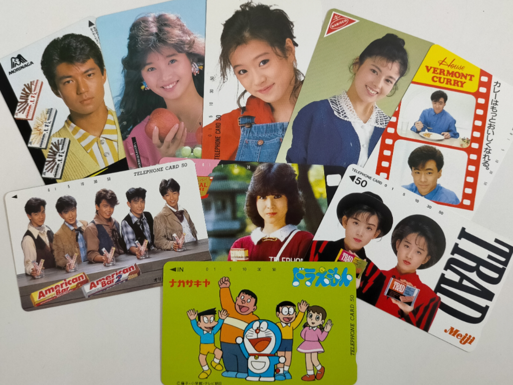下の写真は買い取ったテレホンカードの一部ですが、なつかしいアイドルの顔が並んでいますね。誰だか分かりますか?
