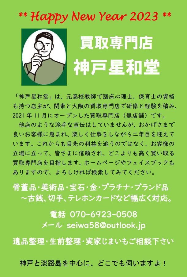神戸星和堂は「安心して依頼できる誠実な買取専門店」として、今年も神戸、淡路、そして全国各地で、皆様のお役に立ちたいと願っています。どうぞよろしくお願いします。